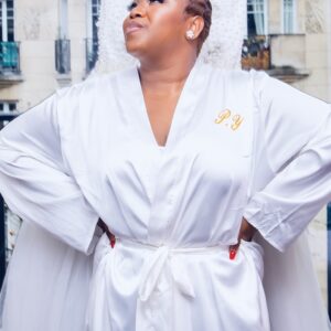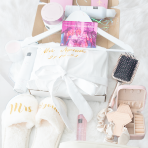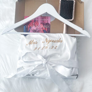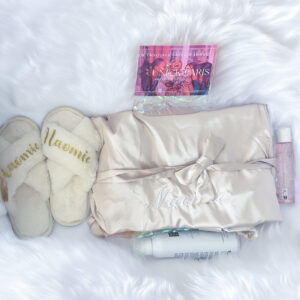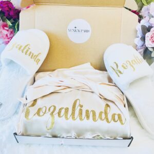 Peignoir où ensemble pyjamas en satin avec des chaussons personnalisés pour seulement 50€ le coffret , les indispensables pour être confortables à la maison et faire plaisir à ses filles d’honneur et dames de compagnie.